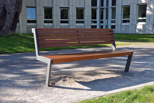 Gestell aus Stahlprofilen, Stärke 30 mm, feuerverzinkt und farbbeschichtet, Sitzfläche und Lehne aus lasiertem Lärchenholz, Eiche oder Kambala